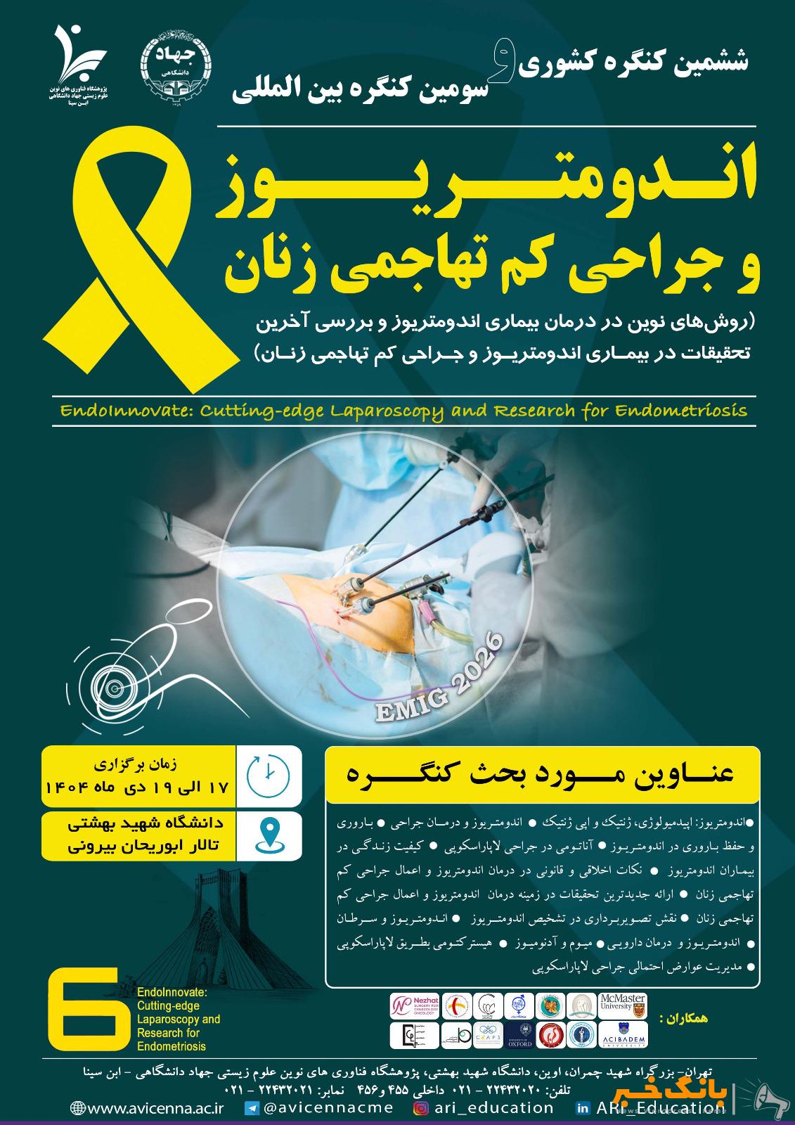 بانگ خبر، به گزارش روابطعمومی پژوهشگاه فناوریهای نوین علوم زیستی جهاد دانشگاهی – ابنسینا، ششمین کنگره کشوری و سومین کنگره بینالمللی اندومتریوز و جراحی کمتهاجمی زنان از ۱۷ تا ۱۹ دیماه ۱۴۰۴ در سالن همایشهای بینالمللی دانشگاه شهید بهشتی تهران برگزار میشود. این رویداد علمی با حضور اساتید برجسته داخلی و بینالمللی فرصتی بینظیر برای همافزایی دانش و انتقال تجربیات در زمینه تشخیص و درمان اندومتریوز و جراحیهای کمتهاجمی زنان خواهد بود.