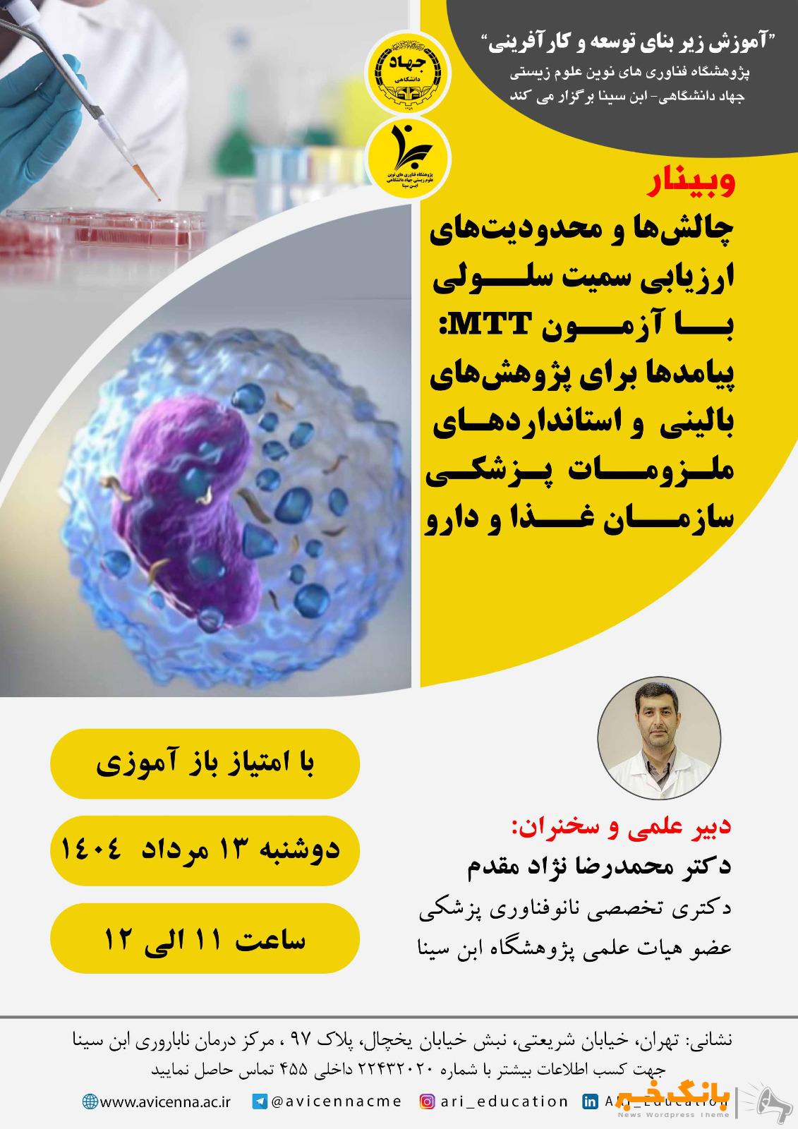 در ادامه مسیر توسعه آموزش‌های تخصصی و ارتقای مهارت‌های حرفه‌ای پژوهشگران، پژوهشگاه فناوری‌های نوین علوم زیستی جهاد دانشگاهی – ابن‌سینا، وبیناری با عنوان **«چالش‌ها و محدودیت‌های ارزیابی سمیت سلولی مبتنی…