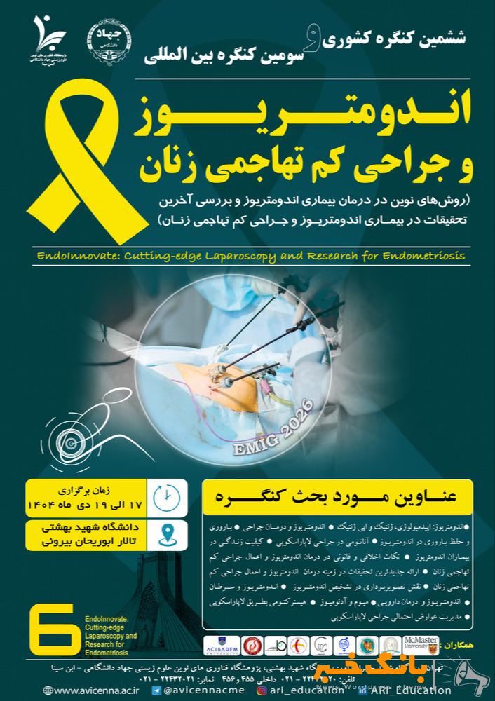 ششمین کنگره بین‌المللی جراحی‌های کم‌تهاجمی زنان و اندومتریوز توسط پژوهشگاه فناوری‌های نوین علوم زیستی جهاد دانشگاهی - ابن‌سینا و مرکز درمان ناباروری ابن‌سینا، از تاریخ ۱۷ لغایت ۱۹دیماه ۱۴۰۴در سالن…